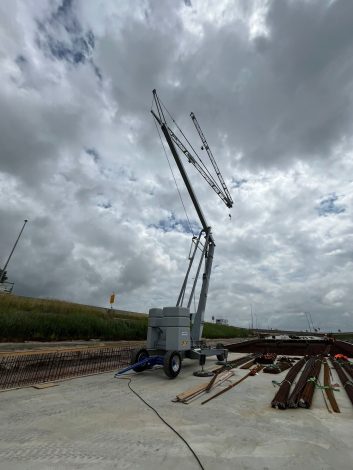 De Vicario OMV 360NL is een elektrisch aangedreven mobiele bouwkraan met een maximale hijshoogte van 22 meter en een hefvermogen tot 2.200 kg. Dankzij de zelfopbouwende functie is deze snel inzetbaar en eenvoudig te bedienen. Het afneembare transportwielstel maakt de bouwkraan mobiel genoeg voor moeilijk bereikbare locaties, zoals de bouwplaats van deze nieuwe tunnel. Indien gewenst, is deze kraan zelfs beschikbaar met elektrisch aangedreven rijmechanisme met hydraulische besturing en radiografische pilotbesturing.